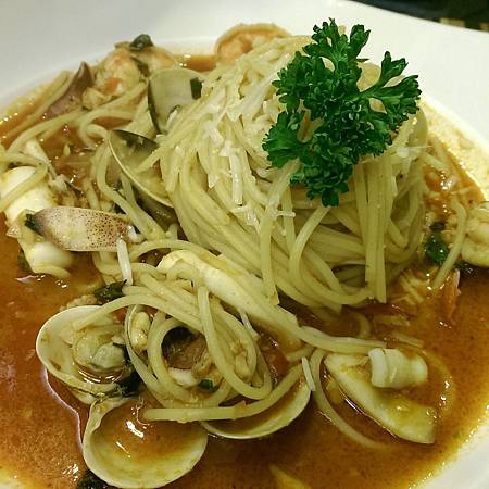 海鮮蚵蠣義大利麵(辣)--酸酸辣辣很夠味(但對我來說太辣哩!!可以點餐前調一下辣度)